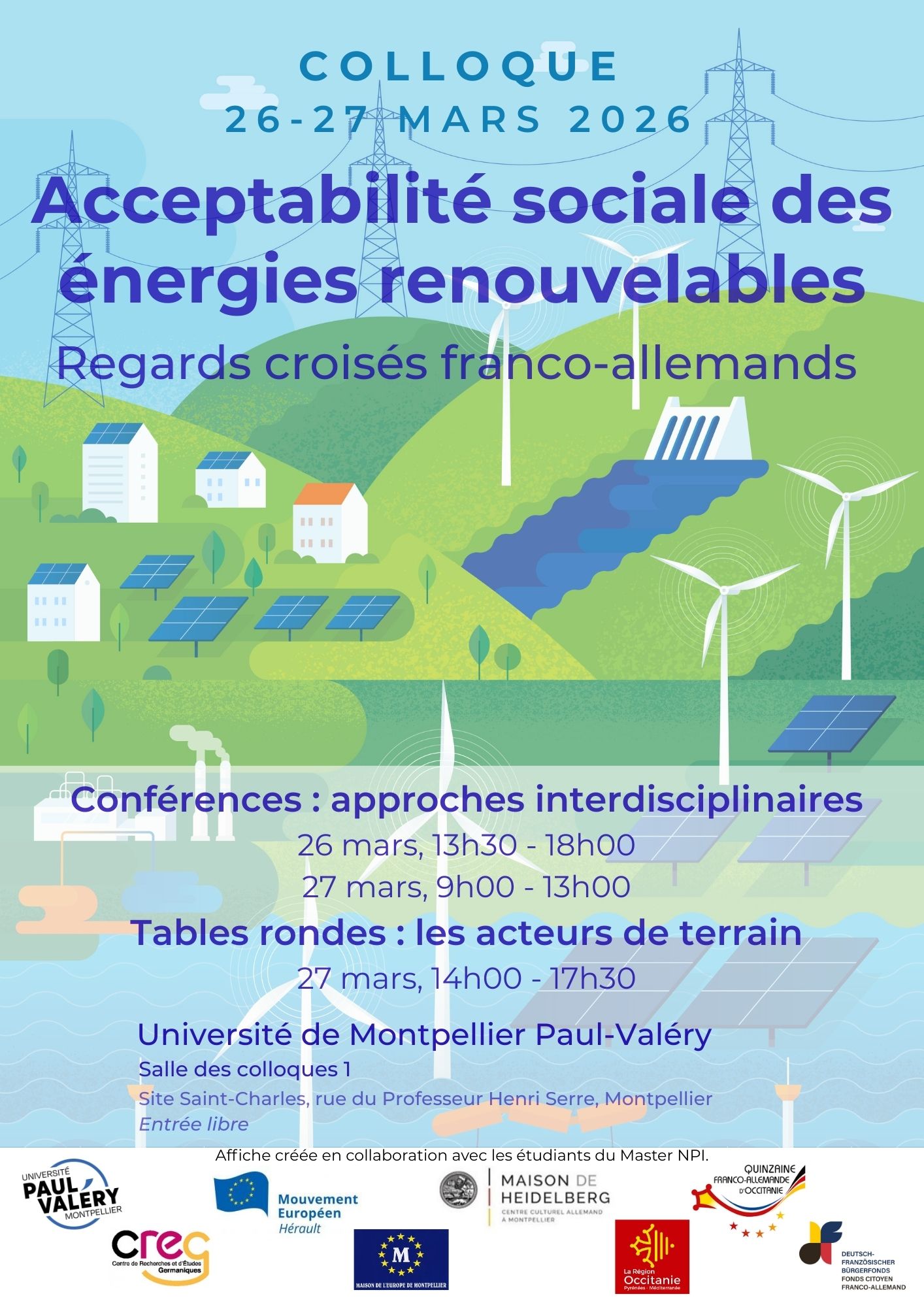 Le colloque pluridisciplinaire vise à explorer et contraster les divers discours politiques, médiatiques et publicitaires qui ont émergé autour des énergies renouvelables ces 30 dernières années en Allemagne et en France pour retracer les arguments pour et contre ces installations mis en avant par les différents acteurs. L’objectif du colloque n’est pas seulement de faire dialoguer différentes disciplines comme la linguistique, la sociologie, le droit, la géographie et les sciences politiques mais aussi d’inscrire les contributions dans une perspective comparative afin de cerner les similitudes et les différences qui existent dans les discours et les débats. La prise en compte de l’hétérogénéité sociale des acteurs ainsi que la diversité des débats actuels ou permettent d’étudier l’acceptation et la contestation sous différents angles.